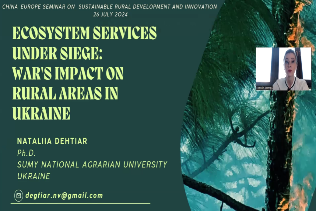 乌克兰苏梅农业大学博士Nataliia Dehtiar作了《Ecosystem Services Under Siege: War's Impact on Rural Areas in Ukraine(围攻中的生态系统服务:战争对乌克兰农村地区的影响)》报告。该报告深入探讨了战争对乌克兰农村地区生态系统服务的影响,揭示农村地区生态系统服务遭受严重破坏,农业生产、水资源保护及生物多样性面临前所未有的挑战。