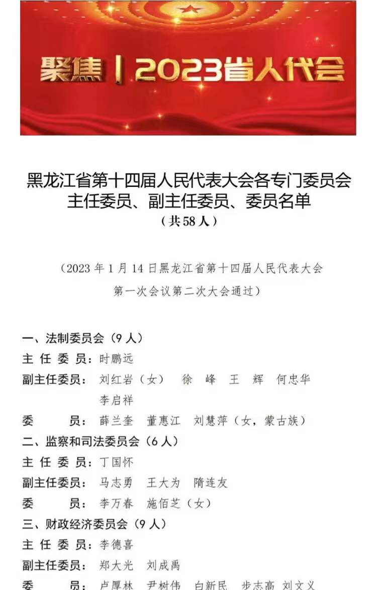 黑龙江省第十四届人民代表大会于2023年1月12日至16日在哈尔滨召开,公司刘慧萍教授当选为省人大代表出席会议,并经大会选举成为我省新一届人民代表大会法制委员会委员。