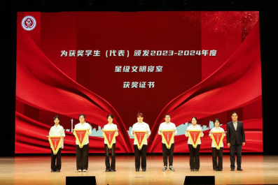 黄善林为获2023-2024学年度星级文明寝室员工(代表)颁奖。