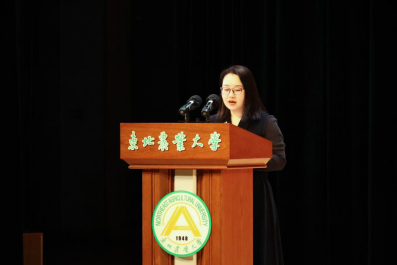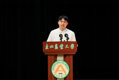研究生代表硕管法2302班程一帆上台发言。他分享了在中俄边境小城支教的经历,以 “祖国需要处,皆是我故乡”的切身体悟,鼓励学弟学妹勇担使命,将历练化作成长养分,深耕热爱领域,以奋斗谱写青春篇章。