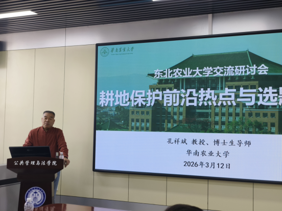 报告中,孔祥斌教授以“十五五”规划为政策锚点,系统梳理了耕地保护领域需协同推进的五大治理需求,细致剖析了极端气象、地缘冲突等外部挑战与耕地空间错配、治理体系分割、种粮内生动力不足等内部困境,深入解读了当前实践中粮食安全、地方发展、农民增收三大目标难以协同的核心矛盾。他从学术、科学、实践三个维度,系统阐释了耕地保护治理转型、资源-社会-经济系统耦合、AI智慧赋能利用等前沿热点方向,并结合自身主持国家自然科学基金及国奖社会科学基金重点项目的丰富经验,从政策导向、科学问题、学术脉络、实践落地四个层面,为参会师生提供了精准的选题方向与申报策略指导。同时,他还分享了全域土地综合整治、“耕地认保+消费帮扶”等典型实践案例,为科研选题凝练、研究框架设计与成果转化应用提供了可借鉴的实践范式。