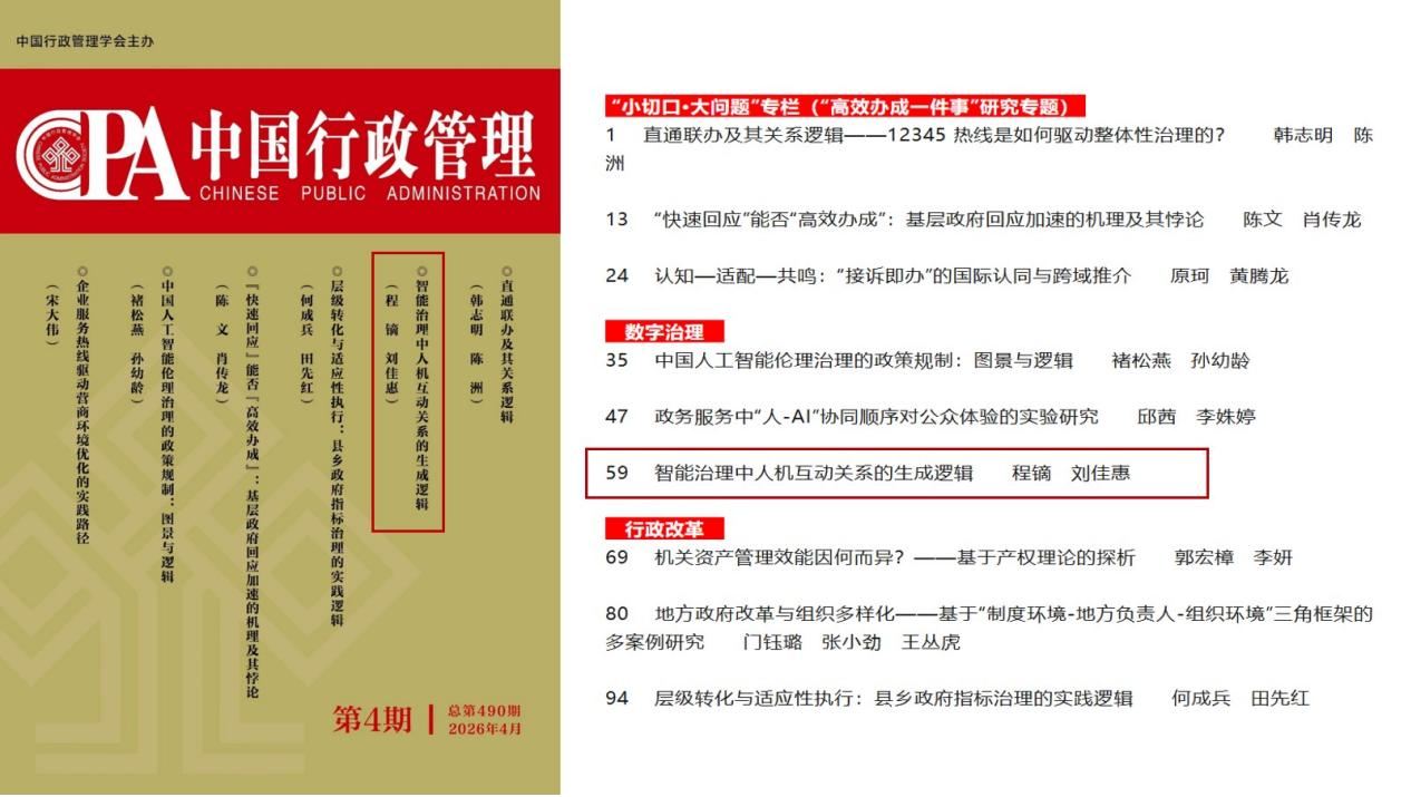 近日,公司程镝教授和硕士研究生刘佳惠在公共管理学权威期刊《中国行政管理》2026年第4期合作发表论文《智能治理中人机互动关系的生成逻辑》,并被列入本期封面目录。