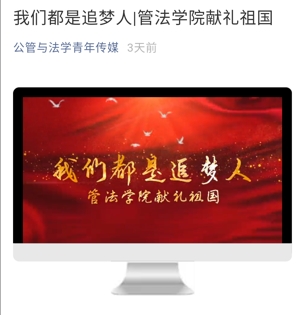 开展“我和我的祖国”爱国歌曲合唱活动。依托公司“七十华章、激情燃唱”十佳歌手大赛的举办,组织获奖选手演唱、录制了爱国歌曲《我和我的祖国》。学院上下通力策划、组织、拍摄、制作了“《我们都是追梦人》——管法学院献礼祖国”视频作品并通过学院官方微信平台进行线上播放,累计阅读量超过1500次。