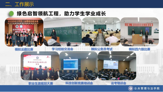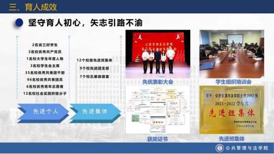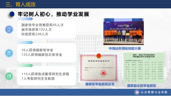 2、牢记树人初心,推动学业发展。学院依托绿色启智领航工程,取得显著育人成果。三年来,学院参加国家级专业竞赛获奖95人次,省市级获奖102人次,校级获奖236人次,16人获得国家奖学金,133人获得国家励志奖学金,三年共110人获得免试推荐研究生资格,7人考取研究生支教团。