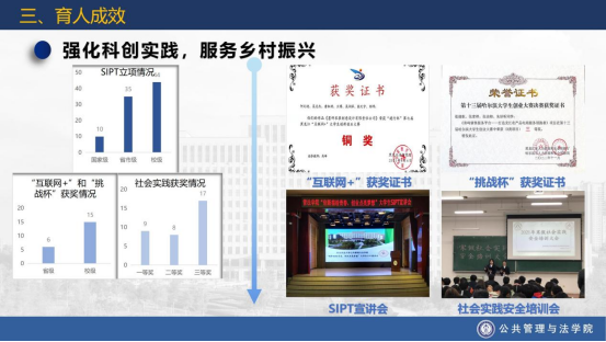 3、强化科创实践,服务乡村振兴。学院发挥专业学科优势,积极推进科技创新工作,三年来完成SIPT国家级立项10项,省级立项35项,校级立项44项。在“互联网+”和“挑战杯”比赛中,累计获得省级奖项6项、校级奖项15项。在社会实践评比中,198支团队成功立项,获校一等奖9项、二等奖8项、三等奖17项。