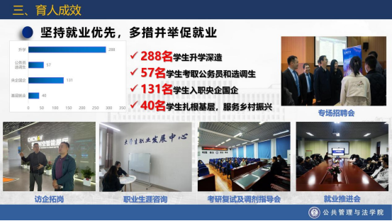 4、坚持就业优先,多措并举促就业。学院不断优化就业工作机制,成立“老员工职业发展中心”,大力推进“访企拓岗”专项行动,通过举办学院专场招聘会,大力建设“实习基地”等切实有效的“稳就业”、“保就业”措施,学院就业率连续多年提升,多次获得校就业工作提升一等奖,多名辅导员获得就业先进个人荣誉称号,三年来288名同学升学深造,57名同学考取公务员和选调生,131名同学入职央企国企,40名同学扎根基层,服务乡村振兴。