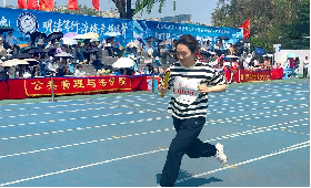 微风拂过绿茵场,卷着年少的意气与拼搏的热望,将满溢的青春活力播撒在跑道边、沙坑旁,让每个跃动的身影都闪耀着热血光芒。运动会期间,管法学子以文明有序的观赛风貌传递学院温度,垃圾随身带走,保持观众席的干净整洁,同时也携带主题垃圾桶清扫赛场。观众席后“格物致知锻造强健体魄,明法笃行淬炼竞技风骨”一行字在正午的艳阳下熠熠生辉。看台上,加油助威的鼓点如心跳般急促有力,每一次槌落都为运动员的冲刺注入力量,铜锣声穿透云霄,与此起彼伏的呐喊声交织成激昂的协奏。